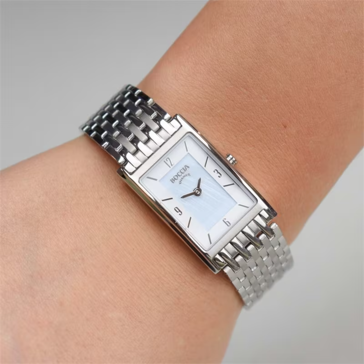 Dit dameshorloge van Boccia Titanium heeft een nette uitstraling. De zilverkleurige rechthoekige horlogekast zorgt voor een stijlvolle look en de parelmoer wijzerplaat maakt het horloge net wat meer chique. Het horloge heeft een rechthoekige kast met een diameter van 21mm, een mineraalglas en is 5ATM. Combineer dit prachtige exemplaar met de andere sieraden van Boccia Titanium voor een complete look. Aan de titanium kast zit een titanium fijne schakel band.