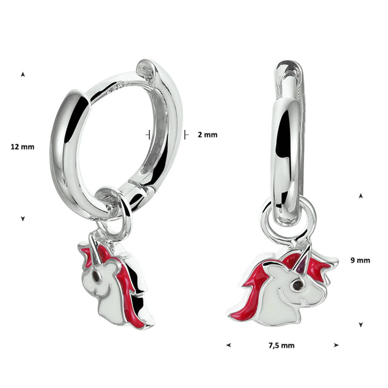 Zilveren oorringen met een unicorn bedel. Unicorn is met roze en wit emaille.