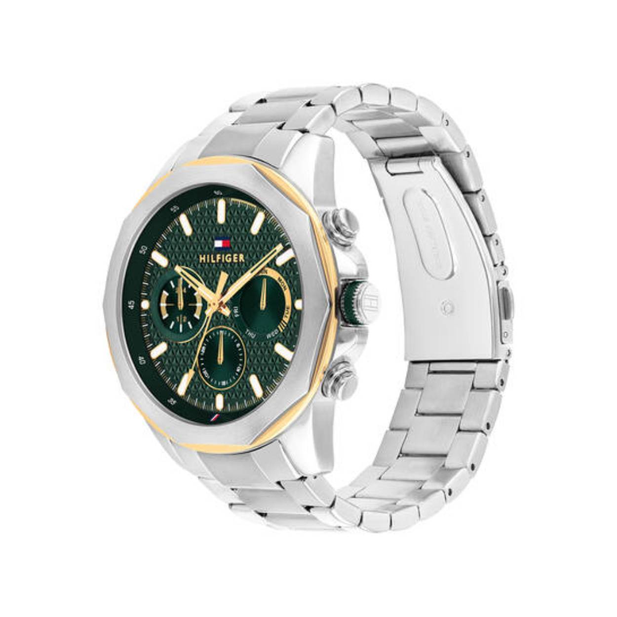 Dit specifieke horloge van Tommy Hilfiger uit de Lars serie met artikelnr: TH1710651 is een casual horloge die zeker in je collectie past. Het herenhorloge heeft een twee lagen kast. Het horloge heeft een groene wijzerplaat, hierop  zijn de datum,- dag en 24-uursaanduiding extra benadrukt. Aan het stoere horloge zit een zilverkleurige mat glimmende schakelband. Verder heeft het een mineraalglas, een doorsnee van 46mm en is 5ATM.