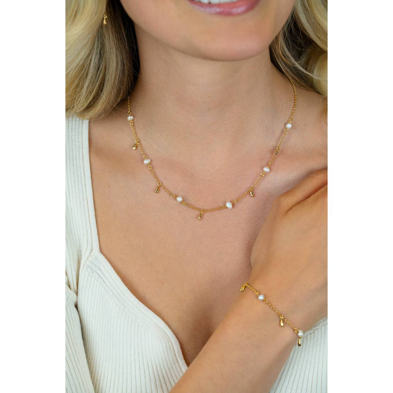ZINZI gold plated zilveren ketting met kleine witte zoetwaterpareltjes en druppelvormige hangertjes. De lengte is te variëren tussen 42 en 45cm. De ketting is vervaardigd van eerste gehalte zilver (925) en extra geel verguld.